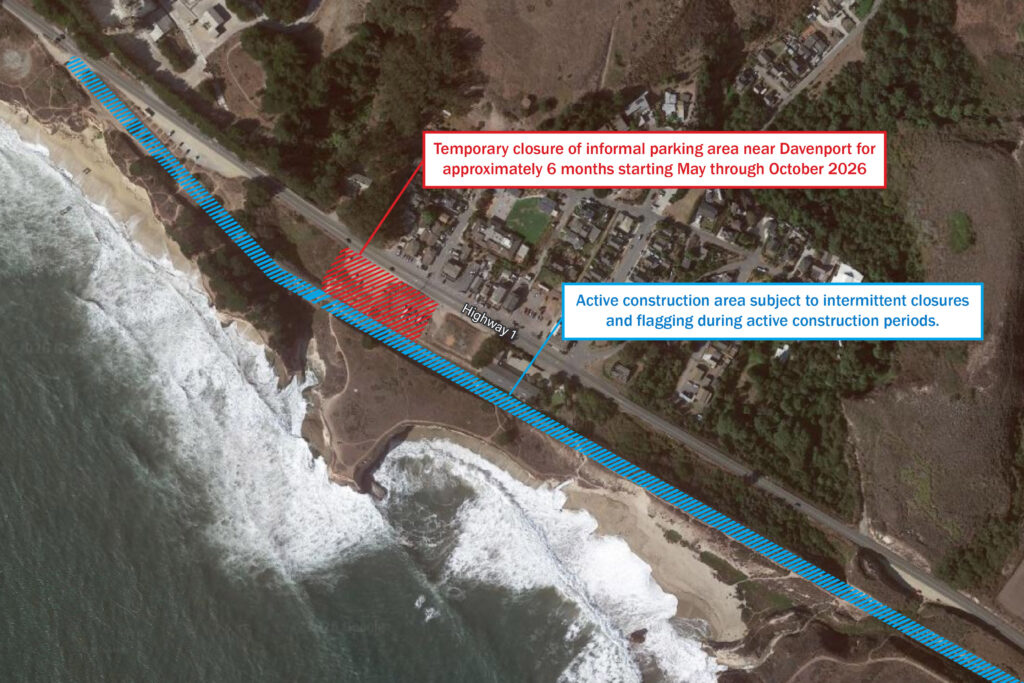 The informal parking area on the coast side of Highway 1 near the town of Davenport will temporarily close for approximately six months beginning in early May to allow for construction of the North Coast Rail Trail, associated parking lot improvements and a new formal pedestrian crossing of Highway 1. Construction activities include, but are not limited to, grading and paving the area into a formal parking lot, utility installation, and installation of signage and amenities. One way traffic controls may be in place during active construction in the vicinity of the project area.