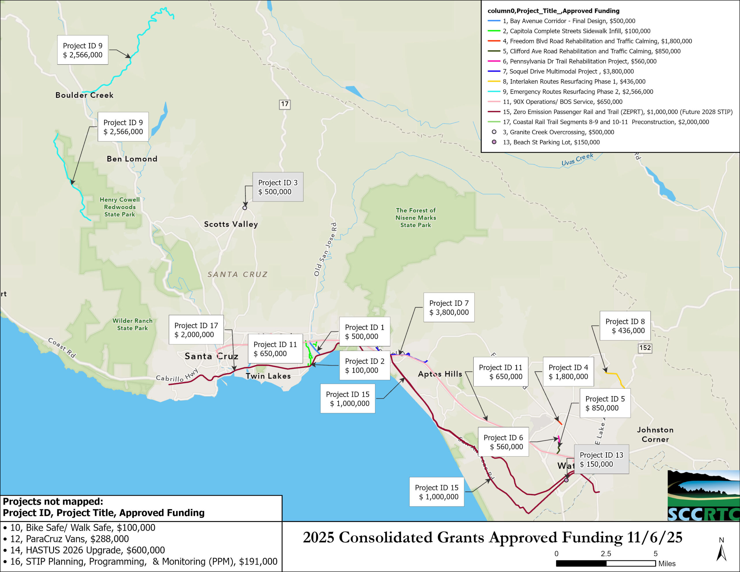The Regional Transportation Commission (RTC) approved local and regional projects to receive approximately $16 million in state and federal funds as part of its 2025 Consolidated Grants Program and 2026 Regional Transportation Improvement Program (RTIP) at its November 6, 2025 Commission meeting. (See Item 18 on the 11/6/25 agenda: https://www.sccrtc.org/meetings/regional-transportation-commission/agendas/).