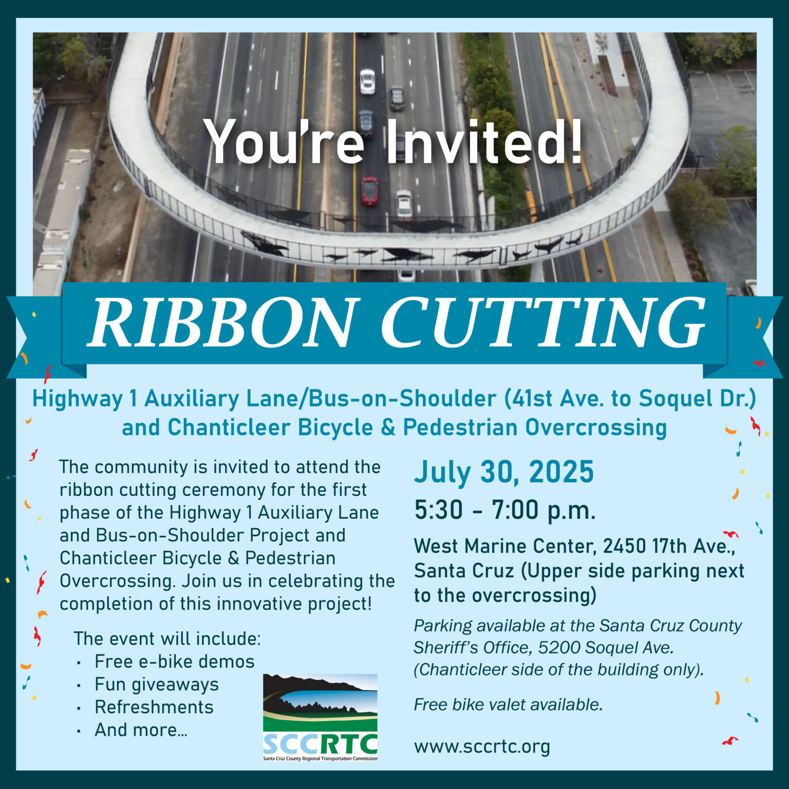 Read MoreThe Santa Cruz County Regional Transportation Commission (RTC), in partnership with Caltrans and the County of Santa Cruz, is excited to announce the new bicycle and pedestrian overcrossing over Highway 1 at Chanticleer Avenue opened to the public […]