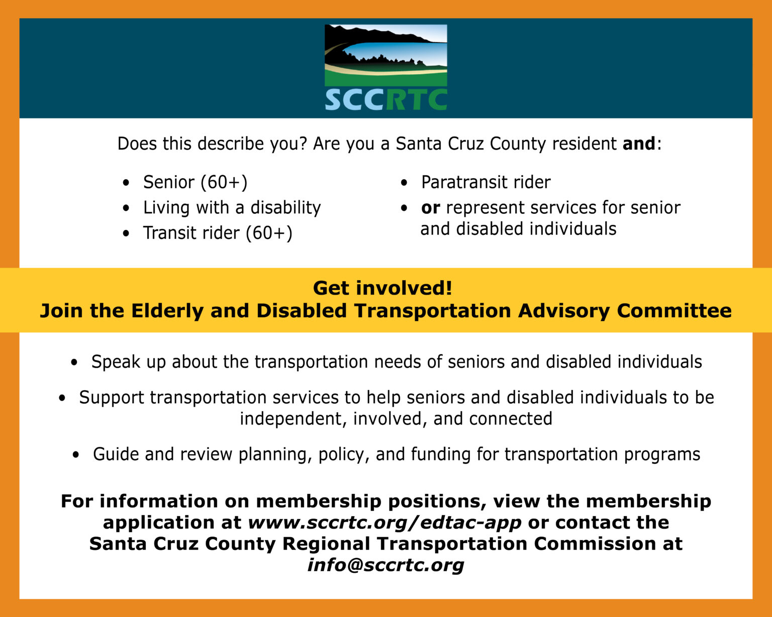 Read MoreDoes this describe you? Are you a Santa Cruz County resident and any of the following: Get involved! Join the Elderly and Disabled Transportation Advisory Committee. As a member of the committee, you will: For information on membership positions, view […]